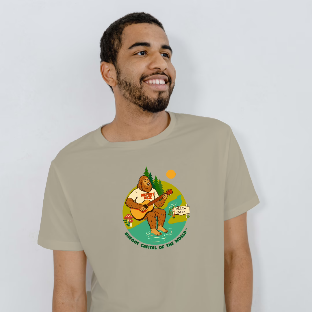Celebrate Willow Creek’s favorite summertime tradition with this cheerful Bigfoot Daze tee, printed on a soft earth-sandcolored fabric that feels like sunshine on the riverbank. The artwork features Bigfoot lounging with his feet in the Trinity River, strumming a guitar while a frog, rabbit, and bird hang out listening to the tunes. It’s playful, bright, and captures everything people love about Bigfoot Daze – joy, music, community, and those long warm days in the mountains.