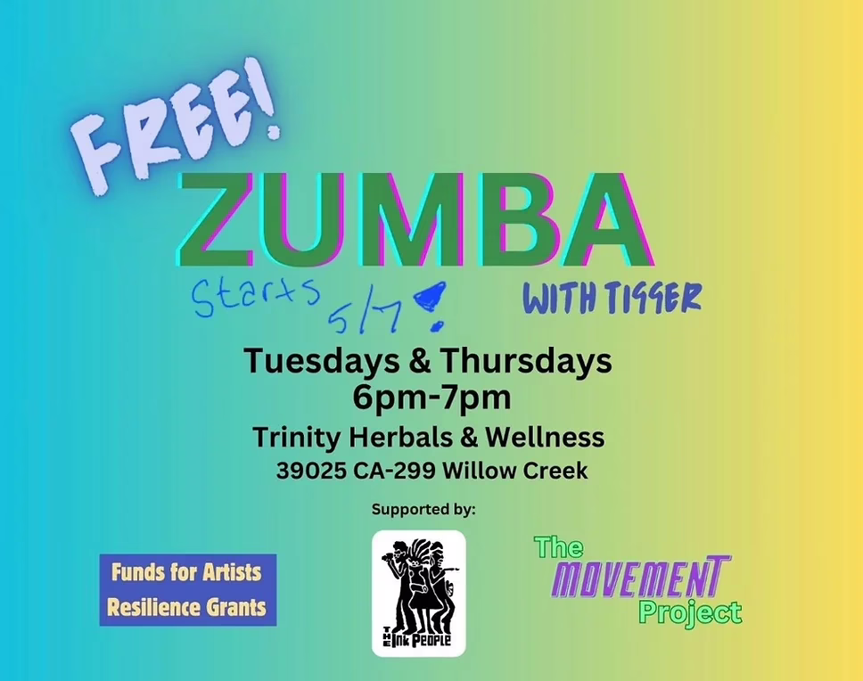 Trinity Herbals & Wellness Center 39025 HWY 299, Willow Creek, CA, United StatesWeekly, Tuesdays & Thursdays. Free! Paid for by Ink People Center for the Arts, Funds for Artist Resilience grant.